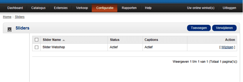 Om de slider aan te passen klikt u op het linkje “Wijzigen” bij de “Slider Webshop”.