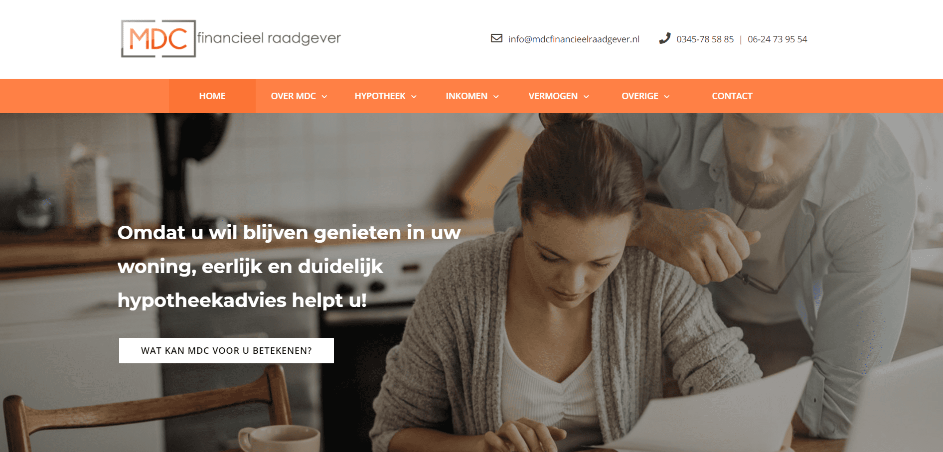 MDC is hét financieel advieskantoor als planner, begeleider & bemiddelaar op het gebied van wonen, inkomen en vermogen. De custom design WordPress website van MDC biedt bezoekers een overzichtelijke uiteenzetting van de geboden diensten, zodat zijn klanten op voorhand een goed beeld hebben wat zij op dat vlak van MDC mogen verwachten. Op deze manier werft MDC online succesvol klanten voor verschillende diensten en zijn diens klanten op voorhand goed geïnformeerd, wanneer zij contact met hem leggen via de website.