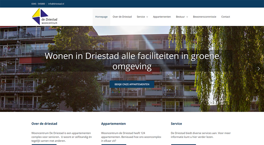 Wooncentrum De Driestad is een appartementen complex voor senioren aan de rand van het woonwijk Terweijde met veel groen en water. Wij hebben een website ontworpen die optimaal aansluit bij de doelgroep. De website is ontwikkeld met WordPress en door het toepassen van een gebruiksvriendelijke visual builder qua content makkelijk te onderhouden door Driestad zelf.